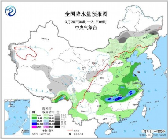 3月20日08時至21日08時,新疆西南部、西藏北部和東部、青海南部、甘肅南部、華北北部、東北地區中南部等地的部分地區有小到中雪或雨夾雪,局地有大到暴雪;山東半島、江蘇北部、安徽北部和南部、湖北東部和南部、湖南北部、江西北部、浙江西南部等地的部分地區有中到大雨,其中湖南北部、安徽南部等地局地有暴雨(50~80毫米)。內蒙古西部、新疆南疆盆地等地部分地區有4~6級及以上風(見圖3)。