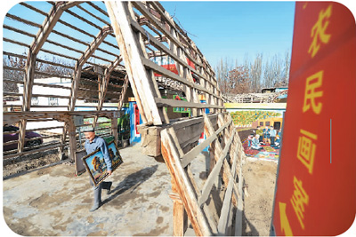 在新疆墨玉縣庫木艾日克村,阿卜力克木·麥麥提敏抱著顧客訂購的油畫走出家門。 |