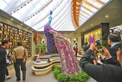 云南展區的“鮮花孔雀”,由3000多枝鮮花裝扮而成。