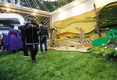 在內蒙古展區,地面鋪上了滿滿的青草,被打造成一片草地。據工作人員介紹,草坪選取的是北京當地具有耐踩踏、節水特性的草種。再通過光照的調節,預計可以在整個世園會期間都保持存活。