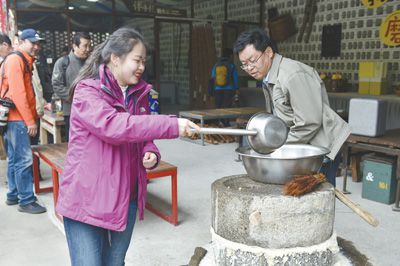 在山東省日照市河山鎮(zhèn)詩茶小鎮(zhèn)的民宿里,游客體驗農(nóng)家磨豆腐。