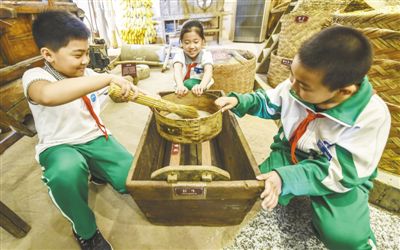 河北省香河縣城內(nèi)第二小學(xué)的學(xué)生參觀農(nóng)家博物館,體驗篩面粉所用的籮床等工具。