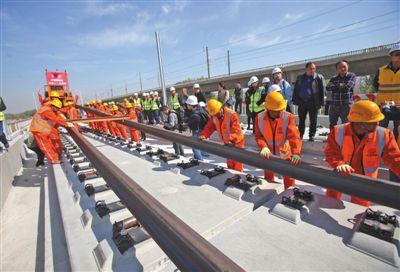 4月15日,北京至雄安新區城際鐵路北京段——李營至新機場站施工現場,工人正在進行鋪軌作業。新京報記者 王貴彬 攝