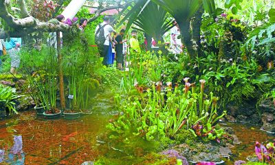 再往里走,植物館內出現一片迷你池塘。“這里布置20多平方米的食蟲島,大部分食蟲植物基本都能在這個小島上看到,有瓶子草、高山捕蟲堇、茅膏菜等。”汪遠說,比如,這種開著小紫花的高山捕蟲堇,葉子表面長滿了絨毛,可以將昆蟲粘在葉片上。茅膏菜的葉片如果遇到昆蟲,葉片將立刻卷起,將蟲子牢牢卷住。而一種“植物大戰僵尸”游戲中的角色捕蠅草也出現在了迷你池塘邊,它的捕蟲院里和捕鼠器一樣,利用自己夾子狀的大葉片可以猛然夾住獵物。