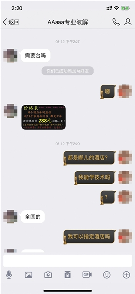 在網上,記者與一位昵稱為“AAaaa專業破解”的QQ用戶取得聯系。該網友提供的一份價格表顯示,“8個酒店房間監控,送12個家庭房間臺,都是對床,活動體驗價288元,僅限一天。”價格表底部還標注稱,“支持任何設備,手機和電腦都可以操作。”