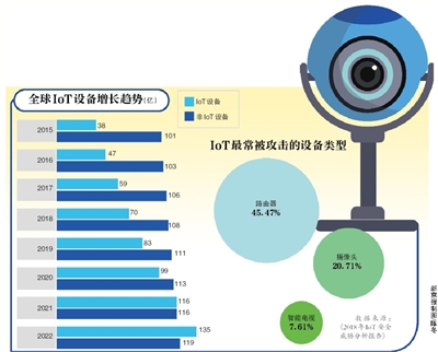 騰訊安全云鼎實驗室發布的《2018年IoT安全威脅分析報告》顯示,路由器、攝像頭和智能電視是被攻擊頻率最高的三款IoT設備,占比分別達到45.47%、20.71%和7.61%。占據IoT設備攻擊量將近一半的路由器,由于市場保有量巨大,一旦被爆出漏洞,極易引發大范圍的攻擊。