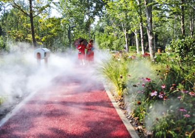 昨日,安德城市森林公園內設置多處噴霧裝置。新京報記者 王貴彬 攝