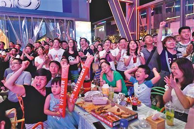 中秋假期,五棵松因為籃球世界杯成為“夜京城”最熱鬧的地方之一。看著大屏幕比賽轉播,喝著啤酒,成了不少消費者“刷夜”的方式。新京報記者 吳寧 攝