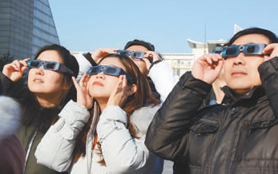 12月26日,在天津科技館,市民戴上專門觀測太陽的眼鏡觀看日偏食。 |