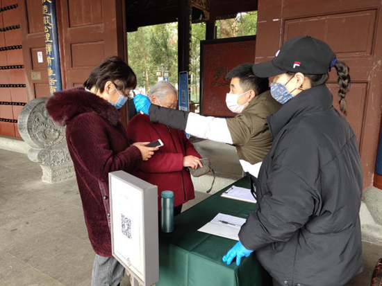 岳王廟景區(qū)入口處,工作人員為游客測體溫。西湖風景名勝區(qū)管委會供圖