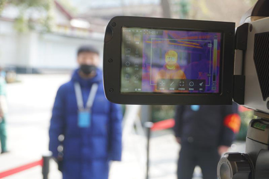 靈隱飛來峰景區(qū)用紅外測溫儀測量游客體溫。西湖風景名勝區(qū)管委會供圖