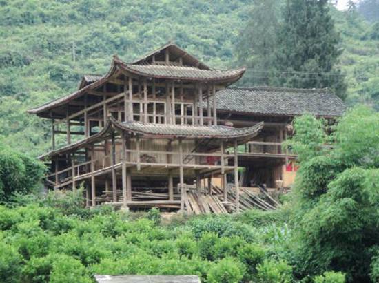 滿山蒼翠中掩映著的土家吊腳樓(孟原 攝影)