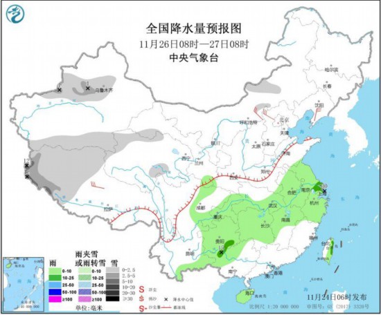 全國降水量預(yù)報(bào)圖(11月26日08時(shí)-27日08時(shí))