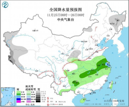 全國降水量預(yù)報(bào)圖(11月25日08時(shí)-26日08時(shí))