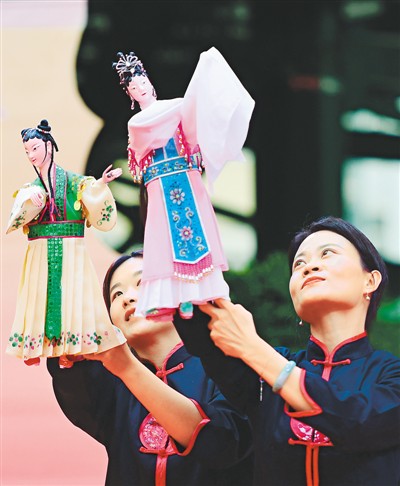 演員在活動現場表演晉江木偶劇團的傳統小戲《掌上情緣》。 |