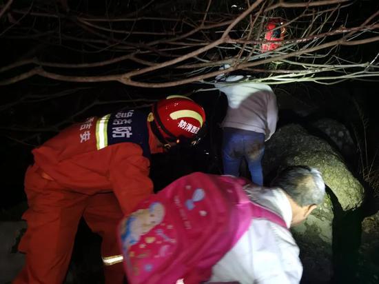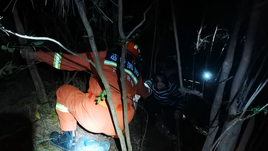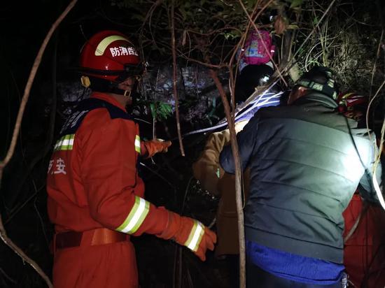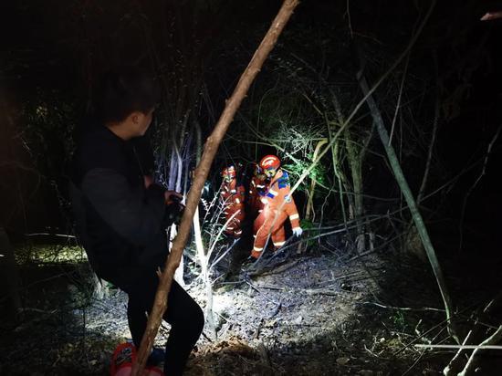 行進過程中, 救援人員根據游客丟棄的瓜果、零食包裝及游客特意掛在途徑道路樹干上的標記,沿路尋找,于晚9時16分在一山澗底部發現了被困游客。