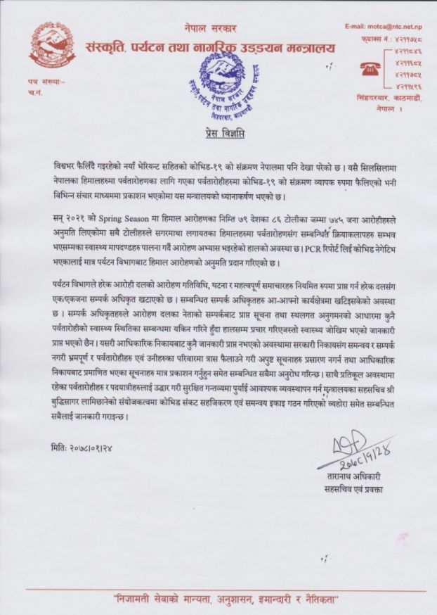 ? ?當(dāng)?shù)貢r(shí)間5月7日晚間,尼泊爾文化、旅游與民航部發(fā)表新聞公報(bào),要求媒體采用官方消息源,不要發(fā)表關(guān)于珠峰等地區(qū)被疫情波及的不實(shí)報(bào)道。